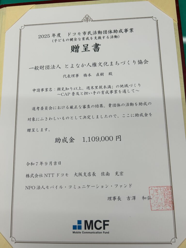 ドコモ市民活動団体助成事業の贈呈書をいただきました。