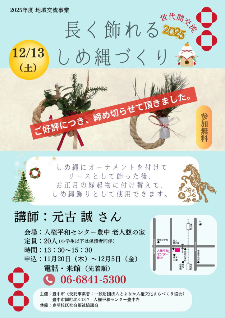 【豊中市委託事業】「長く飾れるしめ縄づくり」満員御礼!