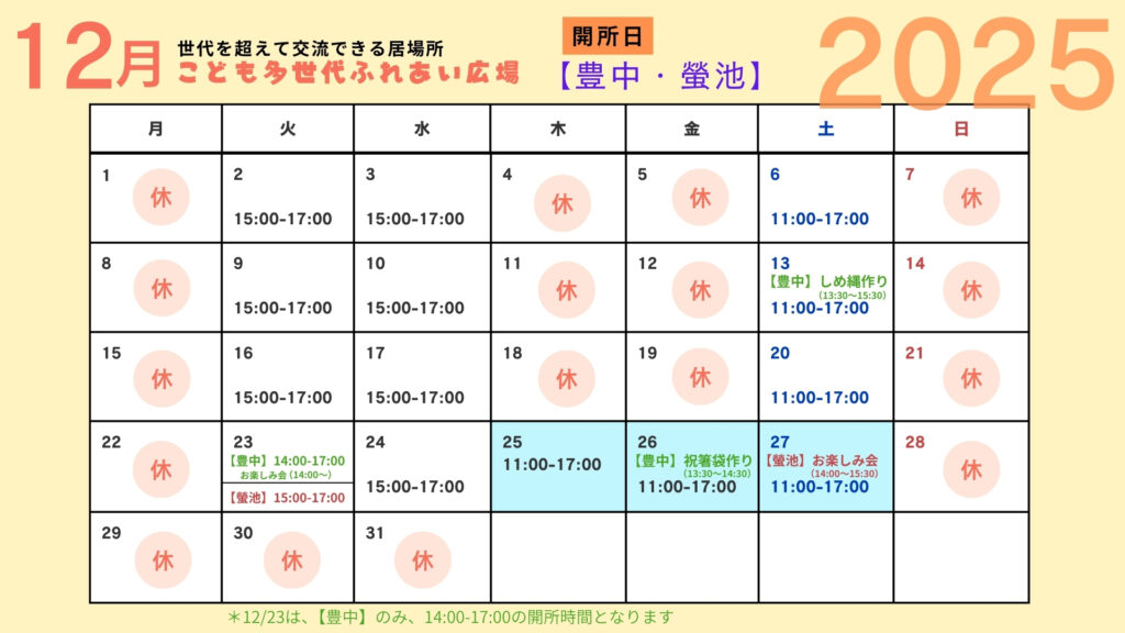 2025年12月および2026年1月の「こども多世代ふれあい広場」は、下記の通り開所いたします。
