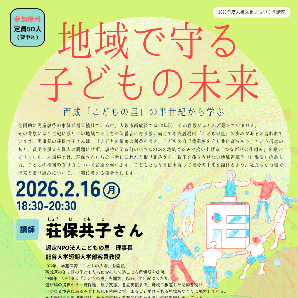 本講座では、荘保さんたちの半世紀にわたる取り組みから、親子を孤立させない地域連携や「居場所」のあり方、子どもの権利の守り方についてお話を伺います。