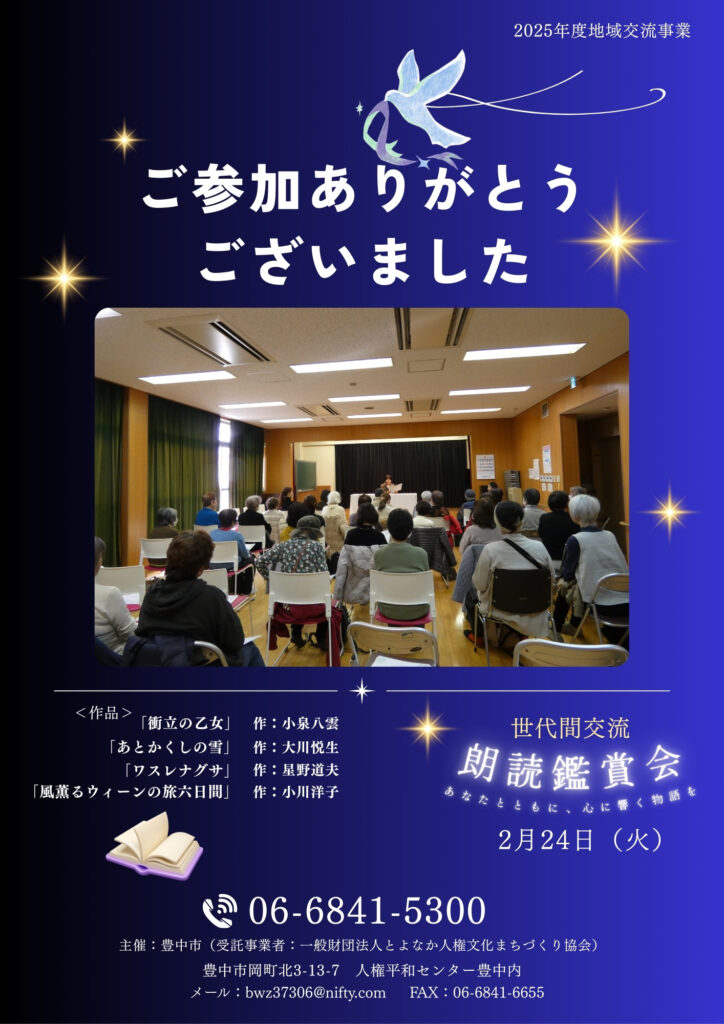 今回の演目は、「衝立の乙女」「あとかくしの雪」「ワスレナグサ」「風薫るウィーンの旅六日間」の4作品。アンケートでは、「目で見るのも良いが、耳で聴くのも良い」との声も寄せられ、朗読の魅力を再確認していただく貴重な機会となりました。ご参加いただいた皆様、そして出演者の皆様、誠にありがとうございました。これからも心豊かなひとときを共有できる場を大切にしてまいります。
