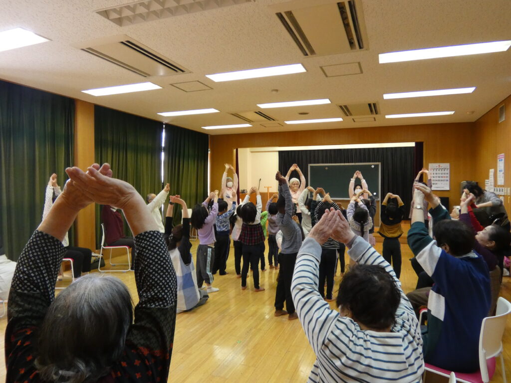 今回の歌体操には、ともだちこども園の子どもたちが遊びに来てくれました。園児の入室時には、参加者のみなさんが拍手で温かく迎え入れ、会場は終始和やかな雰囲気に包まれていました。はじめに、子どもたちより「一年生になったら」の合唱が披露され、元気いっぱいの歌声が会場に広がり、明るく温かな空気が生まれました。続いて、講師の進行のもと、「チューリップ」や「春の小川」の合唱、深呼吸の方法を指導、指先を使った体操など、園児と参加者が一緒に楽しめるプログラムを実施しました。特に深呼吸の場面では、子どもたちが講師の動きをよく見ながら、お腹に手を当てて一生懸命に取り組む姿が印象的でした。また、参加者のみなさんも自然と表情が和らぎ、積極的に身体を動かされる様子が見られました。活動の終盤には、園児と参加者のみなさんが言葉を交わし、帰り際にはハイタッチ✋をするなど、世代を超えた温かなふれあいの時間となりました。
