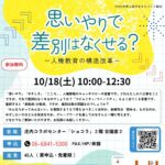 2025-09-24 / 最終更新日時 : 2025-09-25 toyonaka 人権文化まちづくり講座 【豊中市委託事業】「思いやりで差別はなくせる?ー 人権教育の構造改革 ー」人権文化まちづくり講座 「思いやりで 差別はなくせる?」ー人権教育の構造改革ー 2025.10.18(土)10:00-12:30 講師:栗本敦子さん(Facilitator’s LABO“えふらぼ”主宰) 時間:10時~12時30分 会場: […]